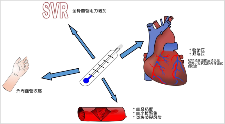 寒冷可以誘發(fā)高血壓,或加重高血壓患者的病情。我國(guó)廣東省的一項(xiàng)橫斷面研究以高血壓患者與正常血壓人群為研究對(duì)象,分析了溫度變化與高血壓患病率和血壓控制率之間的相關(guān)性,結(jié)果顯示低溫可使研究對(duì)象的血壓升高,特別是已患高血壓人群;此外,低溫還能增加高血壓患病率,并降低高血壓患者的血壓良好控制率。
