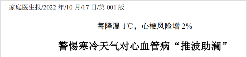 寒冷是心力衰竭的重要危險(xiǎn)因素,早在2010年就有研究表明心力衰竭患者的入院率存在顯著的季節(jié)性變化,入院高峰期為冬季,且住院率與月平均氣溫呈負(fù)相關(guān)。一項(xiàng)大型國(guó)際臨床meta分析顯示心腦血管疾病死亡原因與環(huán)境密切相關(guān),且心力衰竭患者死亡率的增加與寒冷高度相關(guān)。