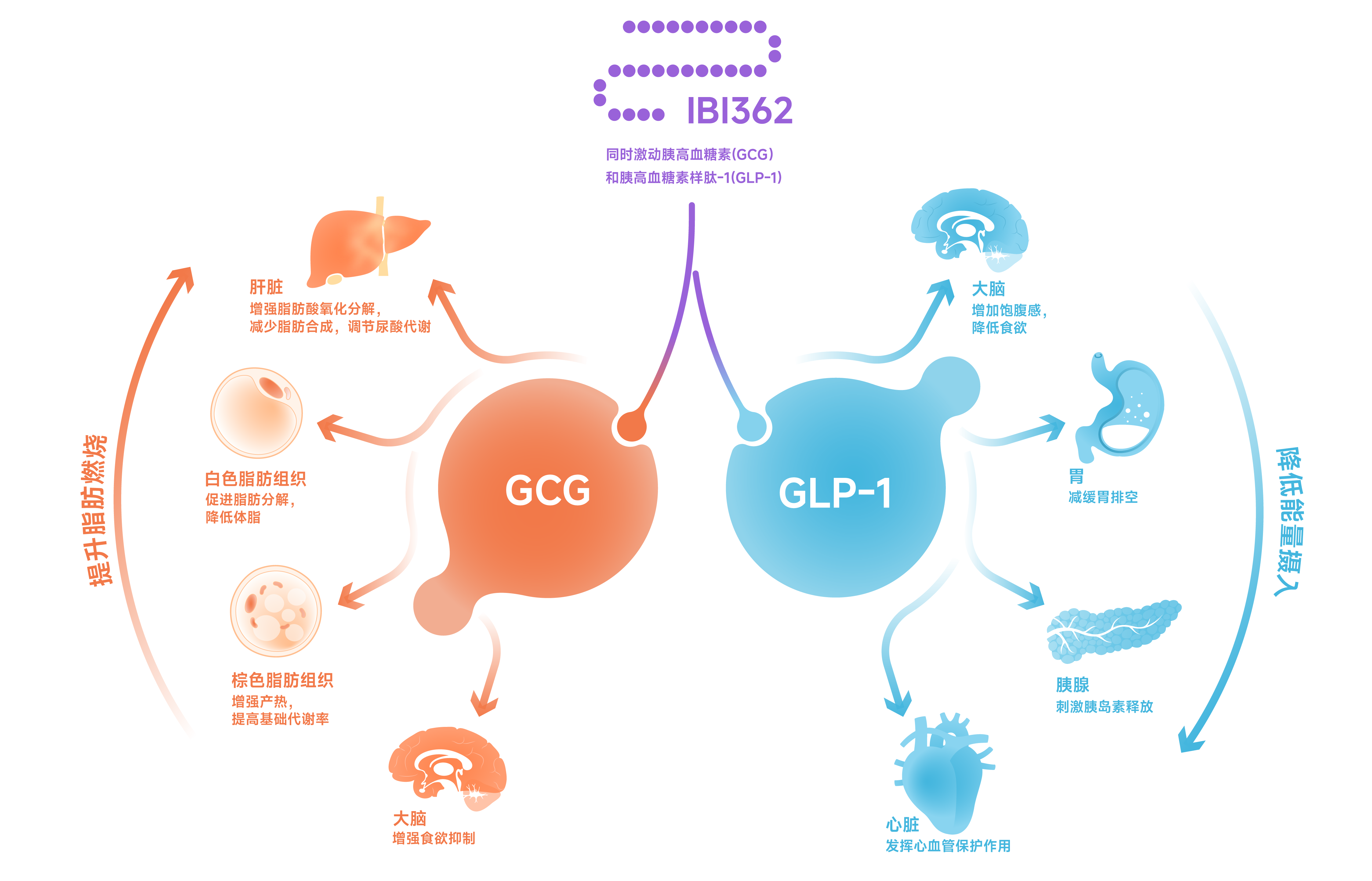 胰高血糖素(GCG)是一種由胰島α細(xì)胞分泌的激素,可通過促進(jìn)糖異生和糖原分解來提高血糖濃度,除維持血糖穩(wěn)定外,胰高血糖素還參與氨基酸、脂質(zhì)代謝以及能量的攝入和消耗。因此,胰高血糖素是一種具有多種生理作用和臨床意義的綜合代謝調(diào)節(jié)激素。胰高血糖素受體激動(dòng)劑通過激活胰高血糖素受體(GCGR),抑制脂肪合成、促進(jìn)脂肪分解和氧化,提高能量消耗并改善肝臟脂肪代謝,肝臟炎癥和纖維化,發(fā)揮“燃脂護(hù)肝”功能,進(jìn)一步增加減重效果。