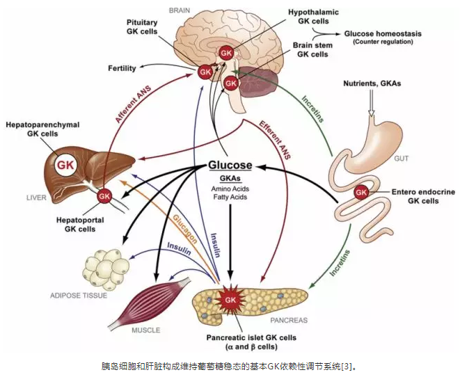 葡萄糖激酶(Glucokinase,GK)是己糖激酶的四種亞型之一,其在葡萄糖代謝的第一步中催化葡萄糖的磷酸化以產(chǎn)生葡萄糖-6-磷酸。葡萄糖激酶活性與胰腺中葡萄糖調(diào)節(jié)的胰島素和胰高血糖素分泌緊密相關(guān),充當葡萄糖傳感器。在肝臟中,葡萄糖激酶在餐后處理葡萄糖并以葡萄糖依賴性方式將其轉(zhuǎn)化為糖原。因此,葡萄糖激酶在葡萄糖穩(wěn)態(tài)中具有重要作用。[2]