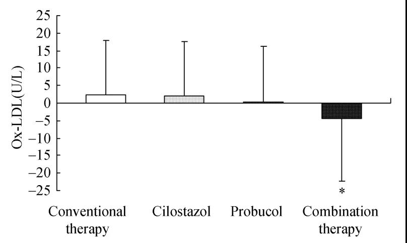 2008年10月至2009年8月在北京大學(xué)第一醫(yī)院、北京協(xié)和醫(yī)院、北京醫(yī)院、北京解放軍總醫(yī)院、北京解放軍第二炮兵總醫(yī)院的多中心臨床研究,165名年齡在40-75歲之間的2型糖尿?。═2DM)和ASO患者,隨機分配接受常規(guī)治療 (47名)、常規(guī)和西洛他唑治療(37名)、常規(guī)和普羅布考治療(43名)、常規(guī)以及西洛他唑和普羅布考的聯(lián)合治療 (38名)。治療12周后,聯(lián)合治療組(Combination therapy)的血清ox-LDL水平比常規(guī)治療(Conventional therapy)具有顯著的降低趨勢(P = 0.065),降低了4.47±17.84U/L[8]。