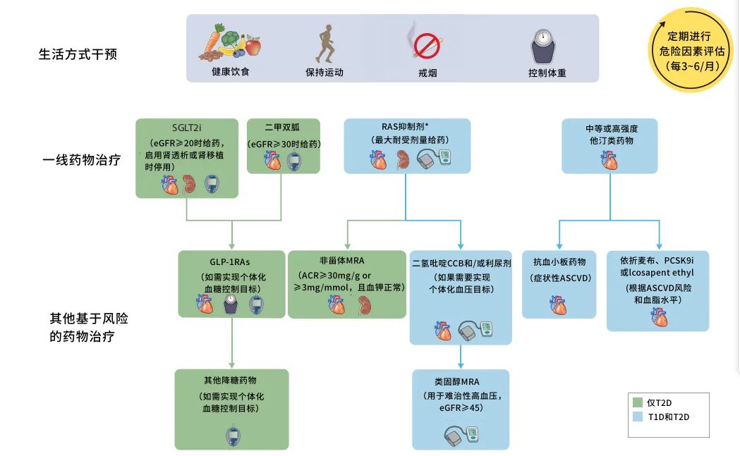 相關指南建議2型糖尿病和1型糖尿?。ú〕坛^5年)患者應每年至少檢查尿常規(guī)、UACR和血肌酐(計算eGFR)一次。同時重視對糖尿病腎病危險因素的干預,包括高血糖、高血壓、肥胖(尤其是腹型肥胖),避免腎毒性藥物及食物、急性腎損傷、蛋白攝入過多。研究表明,良好的生活方式、有效的血糖和血壓控制是防治糖尿病腎病的關鍵。