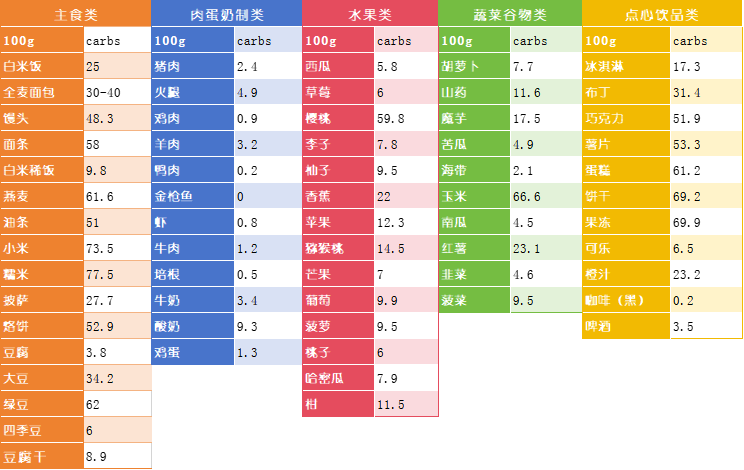常見食物碳水化合物含量一覽表