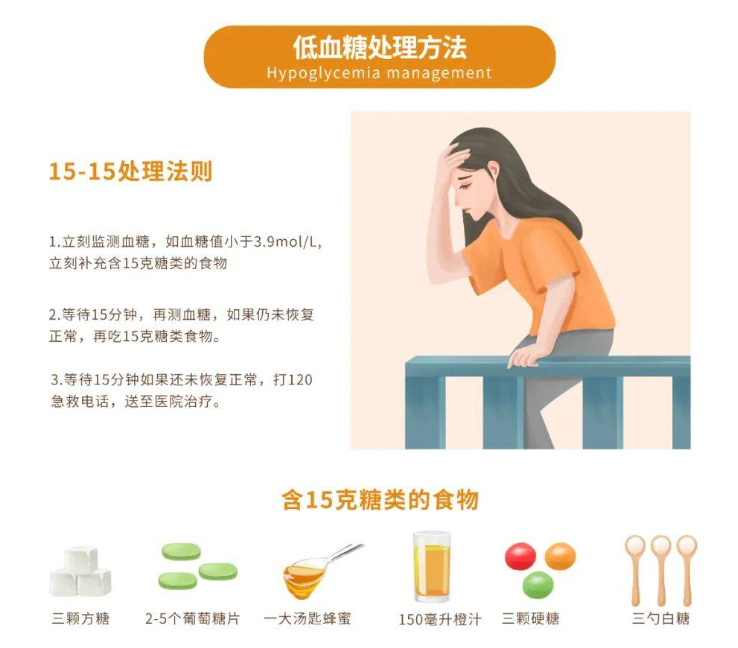 《中國(guó)糖尿病患者低血糖管理的專家共識(shí)》指出:患者發(fā)生低血糖現(xiàn)象,如果神志清醒,可以吞咽,推薦在可能情況下進(jìn)食碳水化合物,如不能安全進(jìn)食,須胃腸道外給糖或藥糾正低血糖。15-15處理法則便是方法之一:攝入15克快速消化的碳水化合物,等待15min再測(cè)血糖,如還未恢復(fù)正常,打120急救電話,送至醫(yī)院治療。