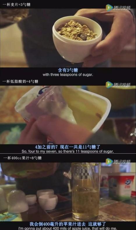 實驗中選取的健康飲食:麥片+低脂酸奶+蘋果汁(試驗中達蒙攝入量:2.5杯燕麥+一杯酸奶+400ml果汁)就這樣簡簡單單的飲食,就高達20勺的糖含量(即60g碳水化合物),且是在未攝入其他食物及零食的情況下。