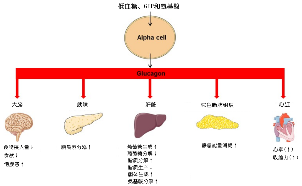胰高血糖素是一種葡萄糖調(diào)節(jié)激素,它通過(guò)刺激肝臟產(chǎn)生葡萄糖來(lái)抵消胰島素的作用,從而提高血糖水平。胰高血糖素能介導(dǎo)幾種非葡萄糖代謝作用,這些作用包括通過(guò)肝臟脂肪分解和酮體生成調(diào)動(dòng)能量資源、刺激肝臟氨基酸代謝以及相關(guān)的尿素生成。