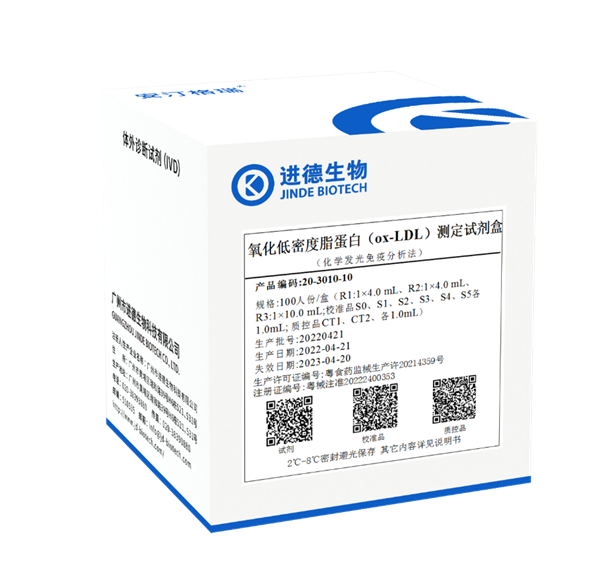 本期帶來由進德生物自主研發(fā)生產(chǎn)的一款重磅產(chǎn)品氧化低密度脂蛋白(ox-LDL)測定試劑盒(化學(xué)發(fā)光免疫分析法),目前已獲批上市,注冊證號粵械注準20222400353,該款產(chǎn)品為全球率先研發(fā)的化學(xué)發(fā)光法氧化低密度脂蛋白(ox-LDL)測定試劑盒。
