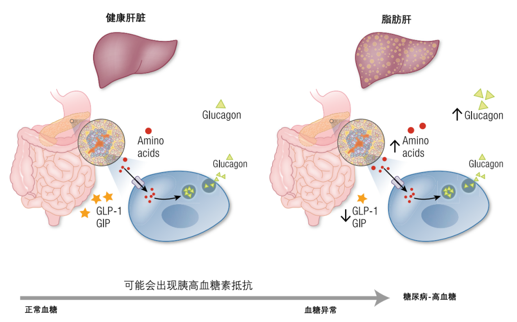 在代謝性疾病中,如2型糖尿病和/或代謝相關(guān)脂肪性肝病,肝臟脂肪變性會在肝臟脂質(zhì)和氨基酸代謝水平上升時導致對胰高血糖素的抵抗,胰高血糖素刺激的尿素生成減少,循環(huán)中的氨基酸水平會升高,這種高氨基酸血癥會導致高胰高血糖素血癥。
